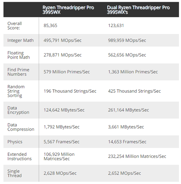 Возвращаясь к новинкам, результаты теста двухпроцессорной системы с Ryzen Threadripper Pro 3995WX показали преимущество над одним таким CPU в среднем на 44%. Само собой, как всегда, прирост зависит от оптимизации конкретного ПО.