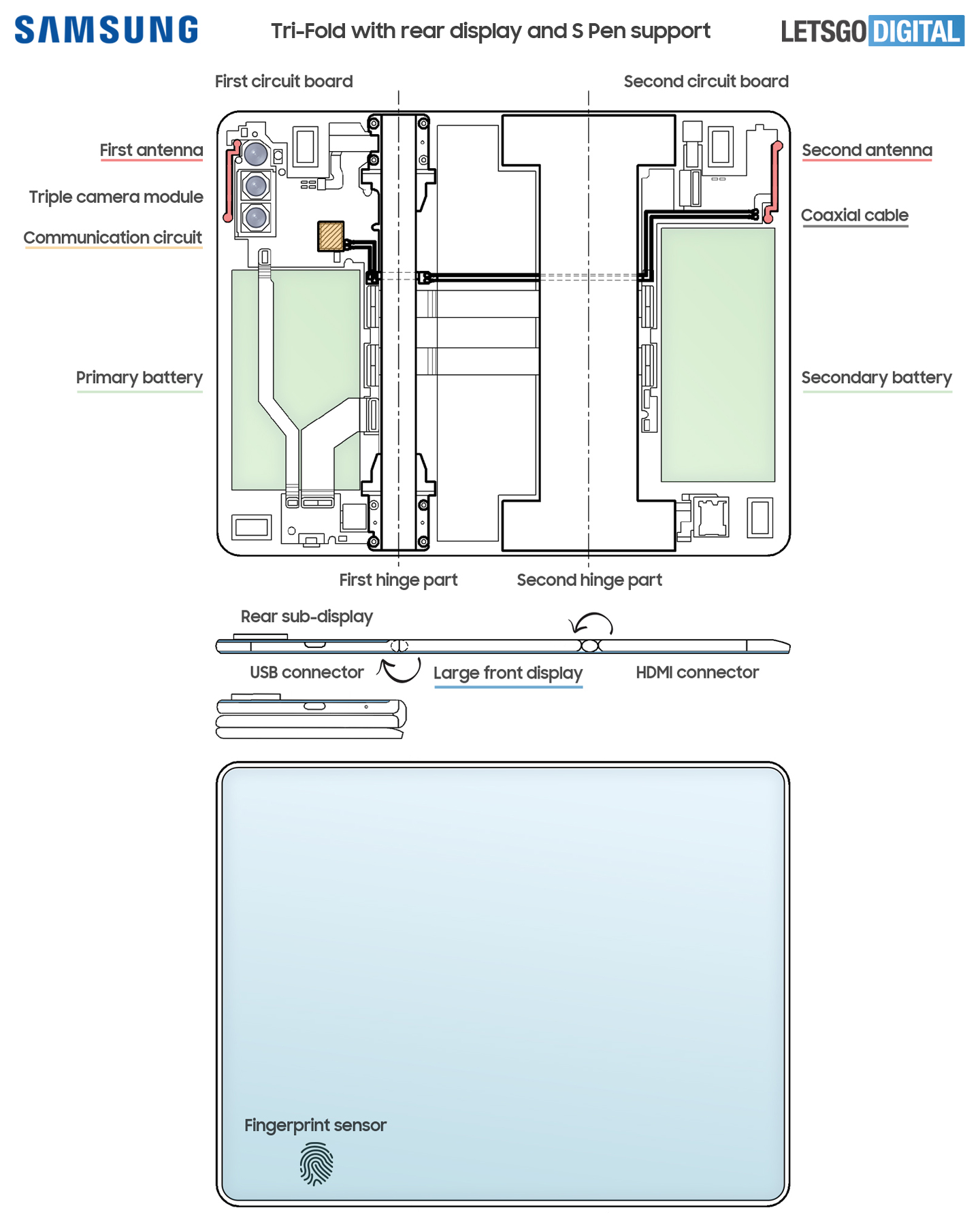 Патент позволяет оценить в том числе внутреннюю структуру устройства. Мы можем видеть, где именно расположены аккумуляторы, отметить тройную основную камеру, антенны, подэкранный сканер отпечатков пальцев и подэкранную фронтальную камеру.