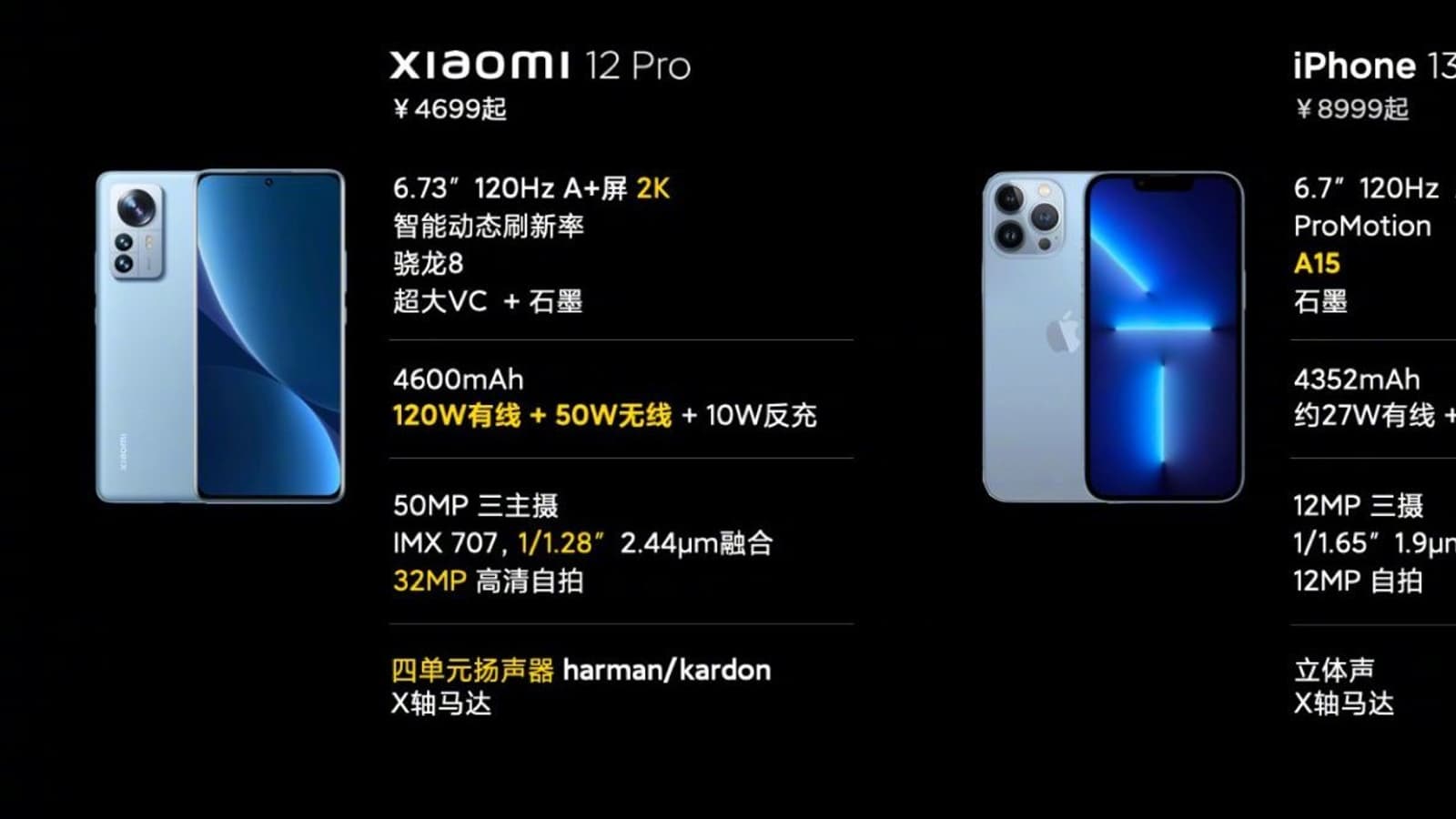 Лэй Цзюнь (Lei Jun), основатель и генеральный директор Xiaomi, опубликовал ещё одно сравнение Xiaomi 12 Pro и iPhone 13 Pro Max вслед за утренним слайдом. После анонса Xiaomi 12 Pro стали известны все характеристики, и теперь можно сравнить эти флагманы не только по габаритам.
