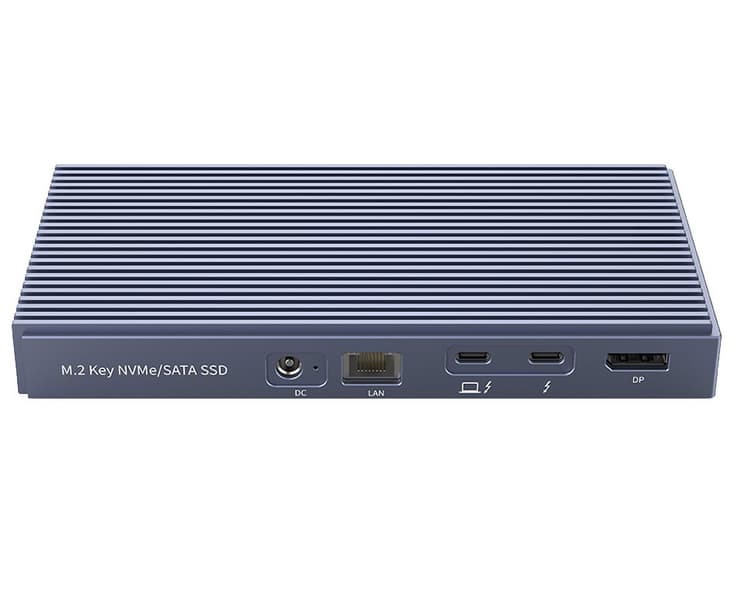 Док-станция размерами 188 x 95 x 24 мм оснащена интерфейсом Thunderbolt 3 (40 Гбит/с) и отличается от многих подобных устройств наличием двух слотов для накопителей типоразмера M.2-2280 с поддержкой SATA и NVMe. Оснащение дока включает видеовыход DisplayPort 1.3, два порта USB 3.2 Gen 2, один из которых выведен на разъём USB-C, два порта USB 3.2 Gen 1, а также один разъём USB-C, предназначенный только для Power Delivery. Он способен выдать 15 Вт, тогда как второй разъём USB-C (Thunderbolt 3), который используется для подключения ноутбука, выдаёт до 60 Вт. Кроме того, есть порт Gigabit Ethernet и звуковой разъём диаметром 3,5 мм для подключения гарнитуры. Док-станция питается от внешнего блока питания мощностью 120 Вт и стоит 400 долларов.