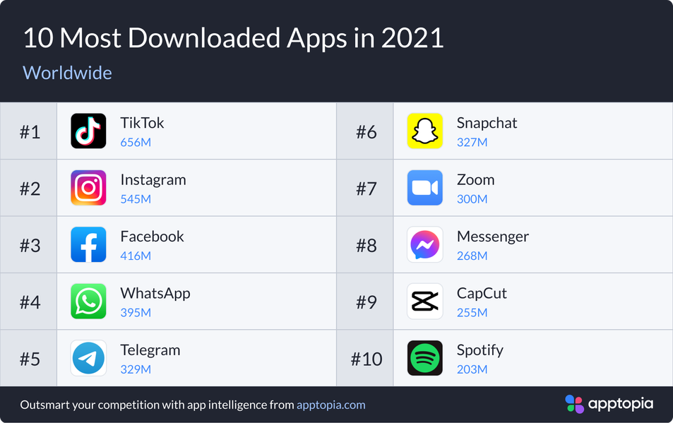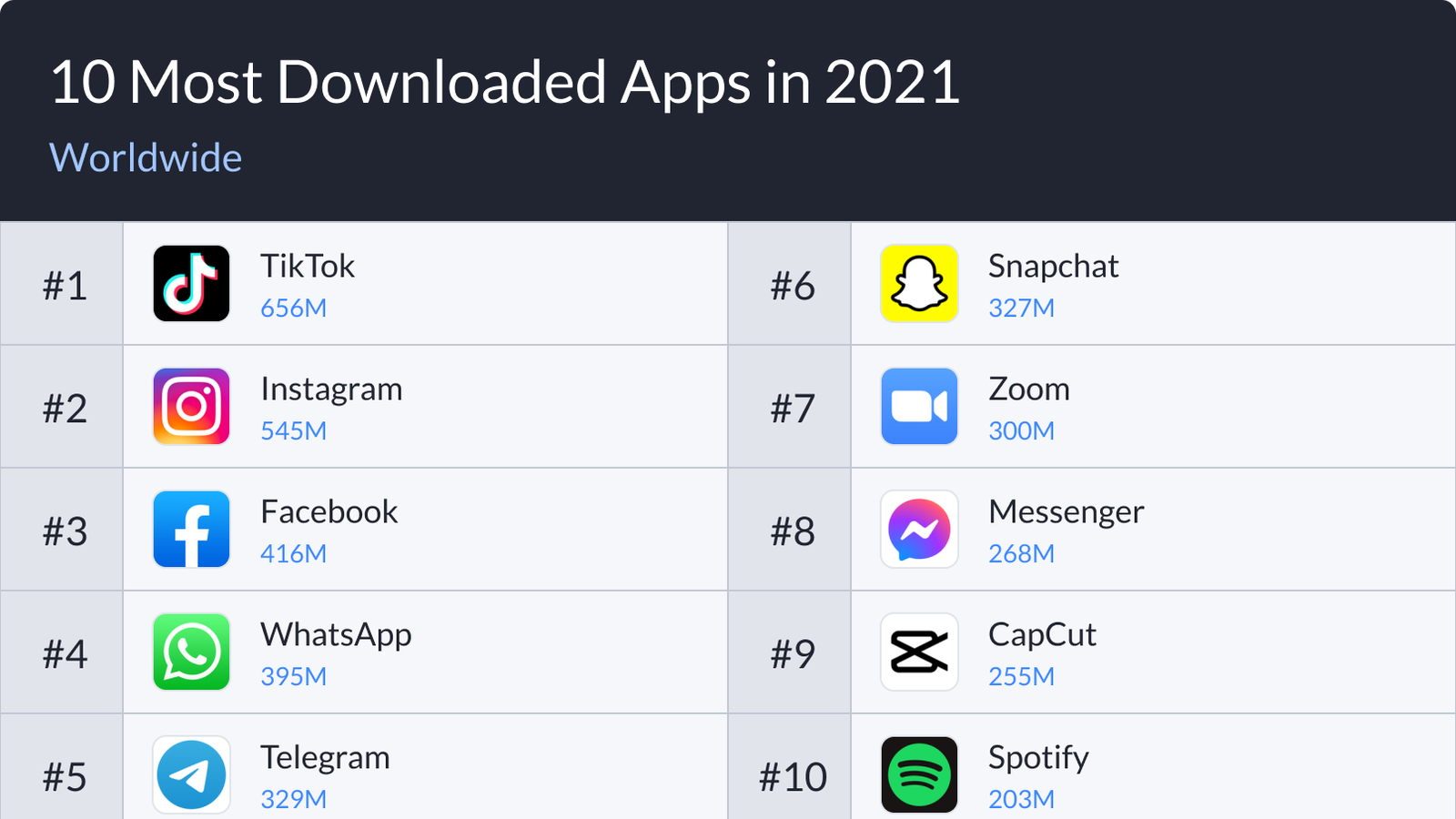 Как и ожидалось, первое место занимает TikTok, а в первую десятку входят такие приложения, как Facebook, Snapchat и Spotify, которые уже стали традиционными лидерами. Примечательно, что четыре строчки рейтинга из десяти занимают программы, принадлежащие компании Meta. Новичком среди них стала программа для редактирования видео CapCut. Это программное обеспечение принадлежит компании ByteDance, владельцу TikTok.