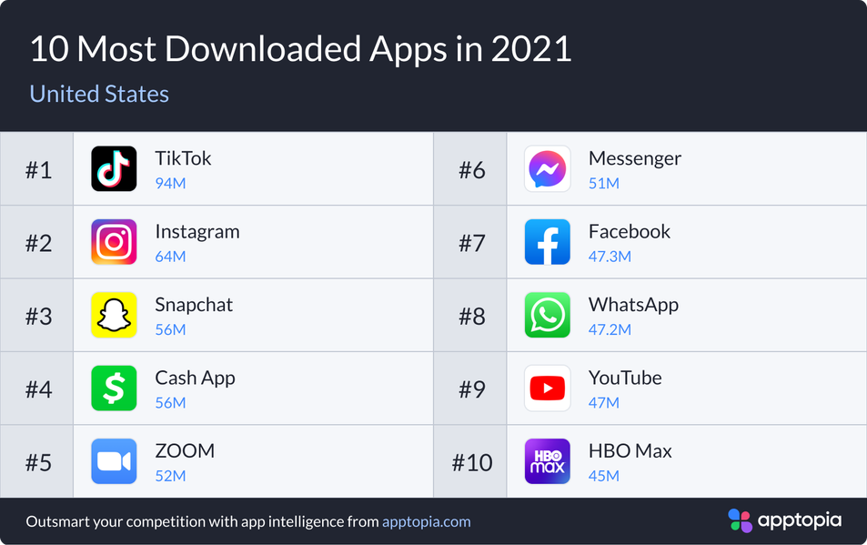 Консалтинговая компания Apptopia опубликовала ежегодный рейтинг, назвав самые популярные приложения в уходящем году. В рейтинге оказались хорошо знакомые приложения, однако есть незначительные различия в рейтингах, составленных для всей планеты и отдельно для США.