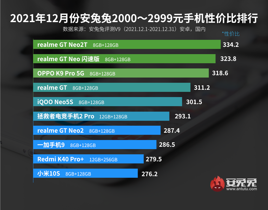 Лидером категории от 2000 до 2999 юаней (от 314 до 470 долларов) стал Realme GT Neo2T, второе место занял смартфон Realme GT Neo Flash Edition, а на третьем оказался Oppo PPO K9 Pro 5G.