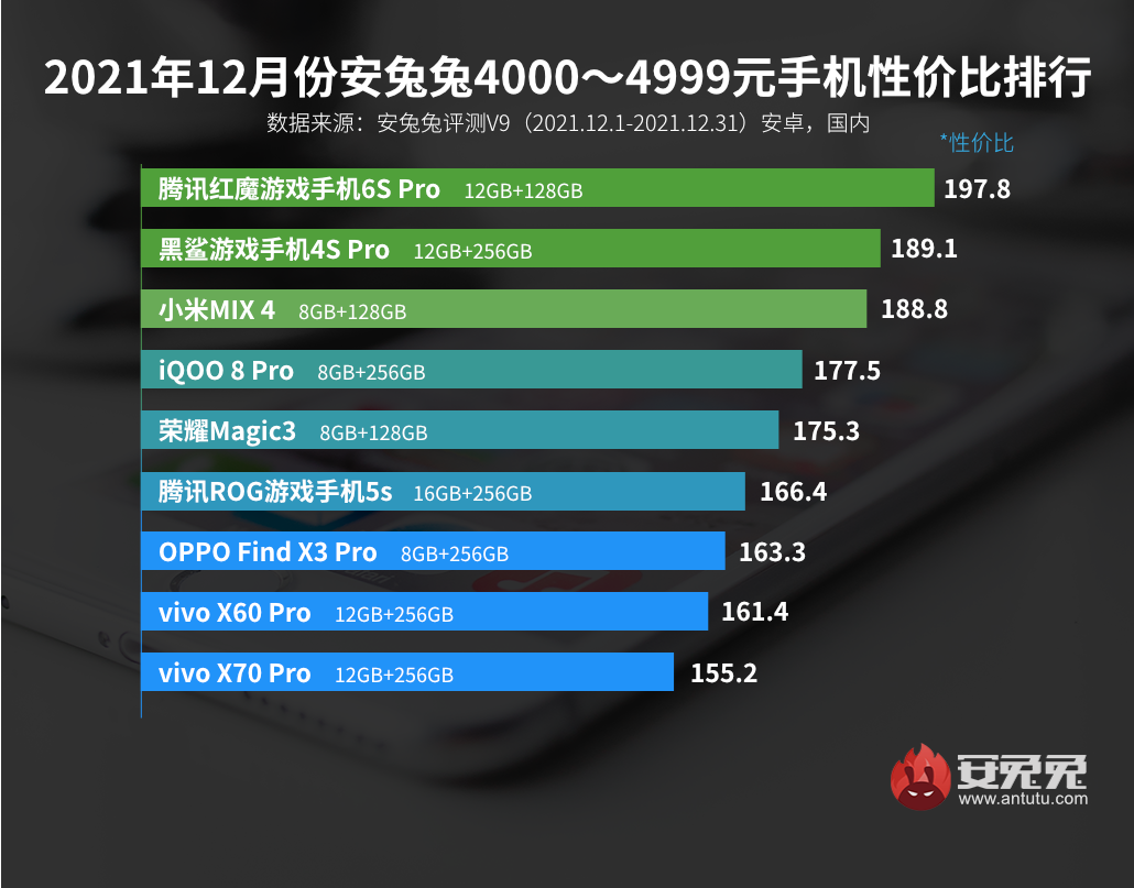 В категории от 4000 до 4999 юаней (от 627 до 783 долларов) первое место занял RedMagic 6S Pro (он же Red Devils 6S Pro), второе принадлежит Black Shark 4S Pro, а третье — Xiaomi Mix 4.