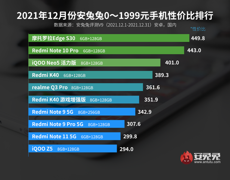 Как отмечают эксперты AnTuTu, конкуренция на рынке смартфонов заставляет производителей постоянно повышать планку. В результате в самом бюджетном сегменте, до 1999 юаней (313 долларов), рейтинг возглавила модель на флагманской платформе Snapdragon 888+. Такие выдающиеся результаты показала модель Motorola Edge S30, дебютировавшая в Китае в декабре. На втором месте находится Redmi Note 10 Pro, а на третьем — iQOO Neo5 Vitality Edition.