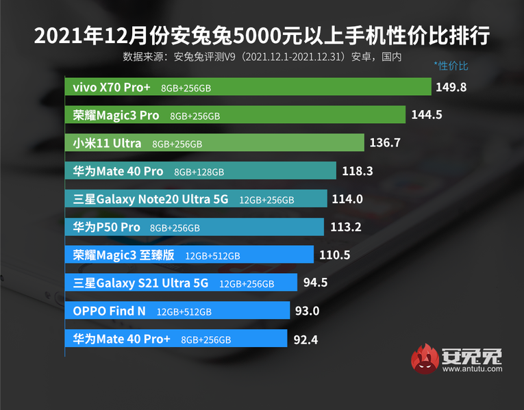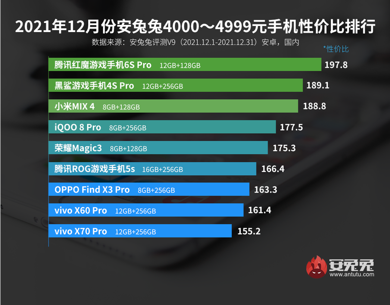 Команда бенчмарка AnTuTu опубликовала рейтинги лучших смартфонов Android по соотношению цены и производительности в разных ценовых категориях по состоянию на декабрь 2021 года.