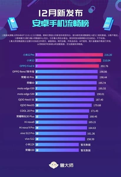 Первое место занял Xiaomi 12 Pro с результатом с 216,20 балла. Вторая и третья позиции принадлежат Xiaomi 12 и Oppo Find N, которые набрали 210,04 и 202,76 балла соответственно.