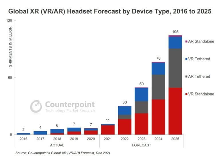 Согласно последнему прогнозу специалистов аналитической компании Counterpoint, мировые поставки гарнитур виртуальной и дополненной реальности (VR и AR) в период с 2021 по 2025 год вырастут примерно в 10 раз — с 11 до 105 млн штук в год.