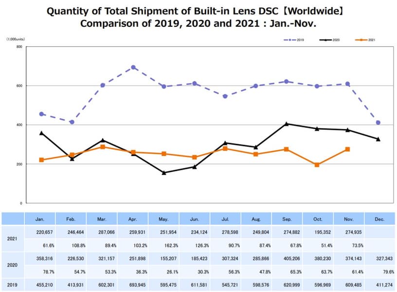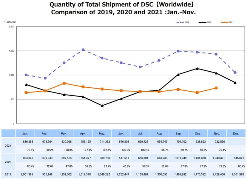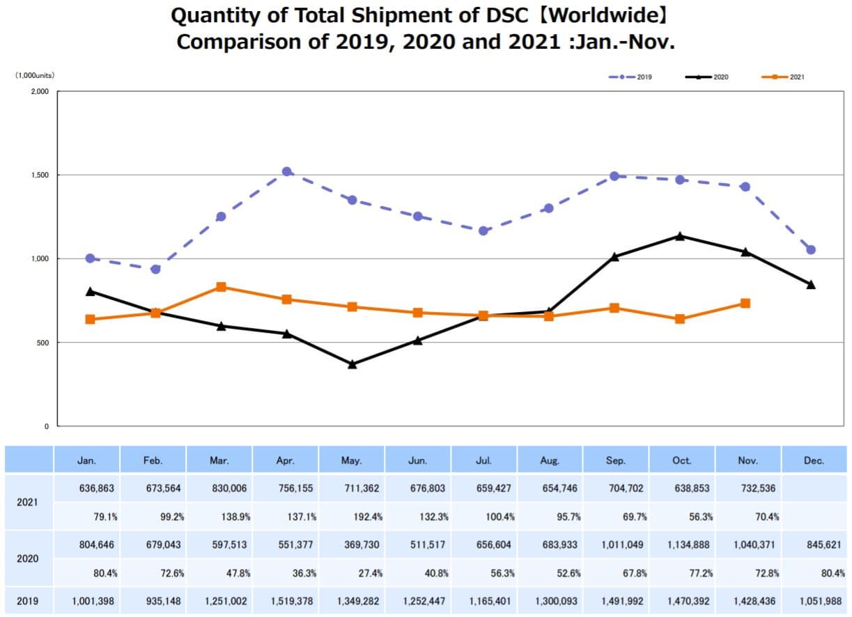 Компактных камер за месяц было продано 247 935 штук. Это значение равно 73,5% значения, зафиксированного в ноябре 2020 года. Примечательно, что в октябре 2021 года было продано всего 195 352 камеры, что составляет 51,4% продаж за октябрь 2020 года.
