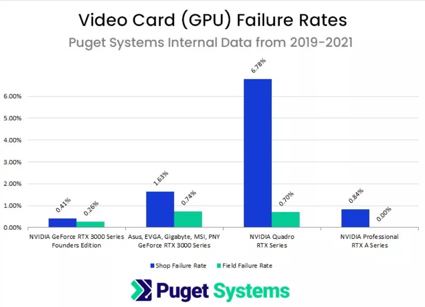 Если рассматривать линейку видеокарт Nvidia RTX, то самыми беспроблемными потребительскими решениями являются модели Founders Edition. Партнёрские видеокарты входят из строя чаще, но и на рынке их банально больше, чем референсных видеокарт.