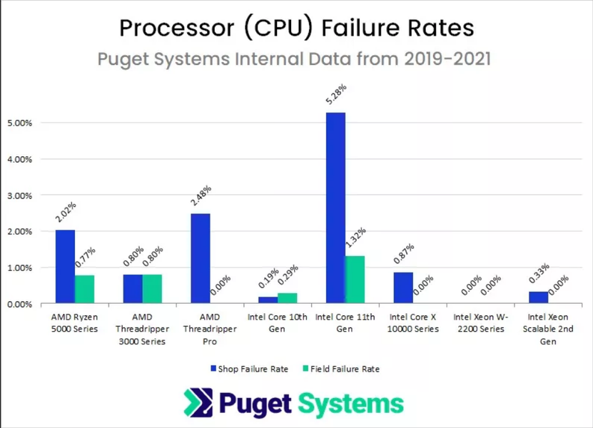 Первый график, с процессорами, говорит о том, что Core 11 у Intel получились далеко не такими удачными, как Core 10: разница в коэффициентах отказа в магазине — почти 30 раз! Даже AMD Ryzen 5000, на которые нередко жалуются ремонтники, выходят из строя реже. Хотя за серверные процессоры Xeon W-2200 Intel можно похвалить — ноль процента брака или отказов.