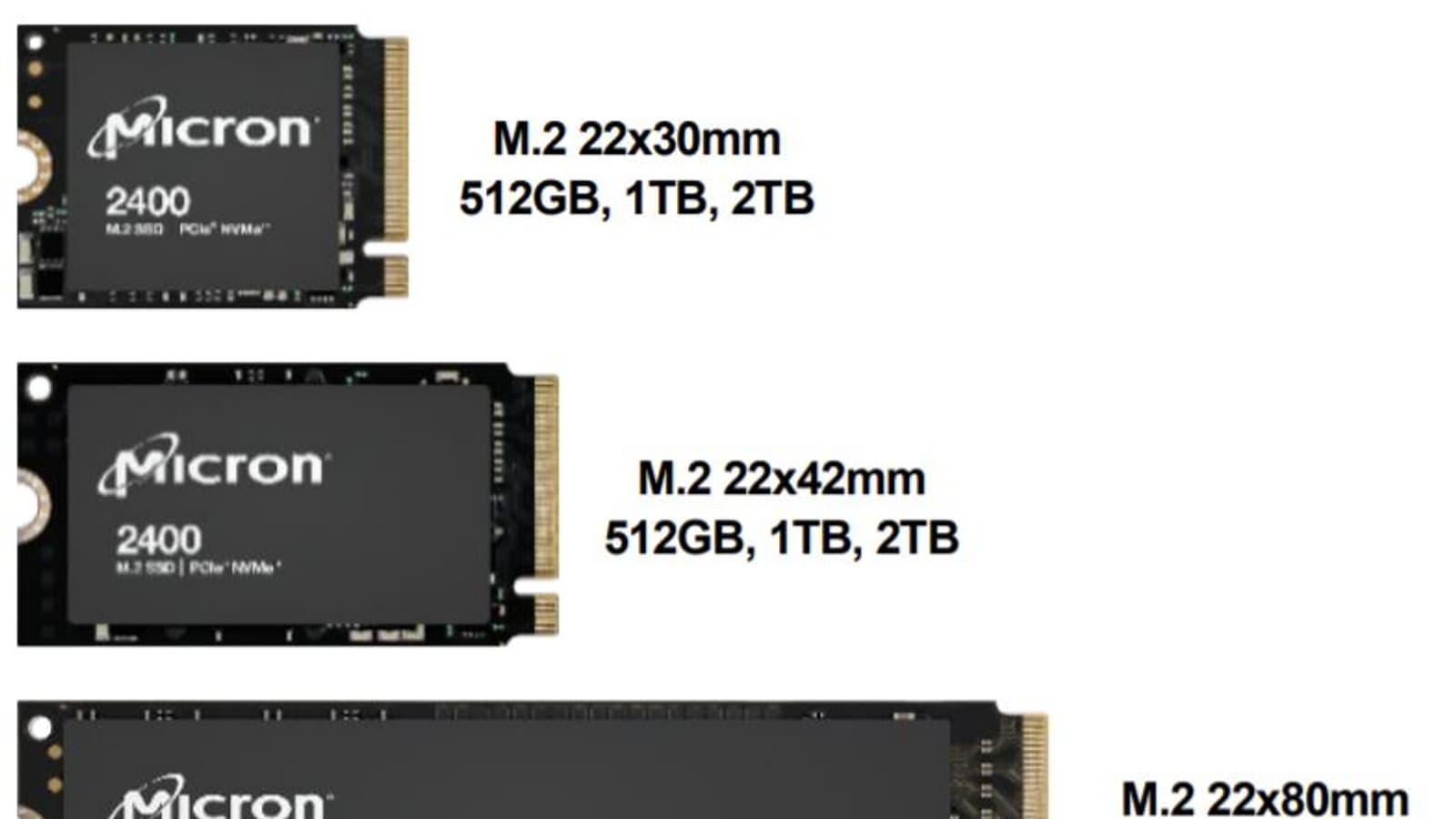 Твердотельный накопитель Micron 2400 является единственным в мире твердотельным накопителем типоразмера M.2 2230, объем которого достигает 2 ТБ. Этот накопитель на 63% меньше выпускаемых сейчас накопителей объемом 2 ТБ, выполненных в типоразмере M.2 2280 мм. Он оснащен интерфейсом PCIe Gen4 и поддерживает протокол NVMe 1.4.