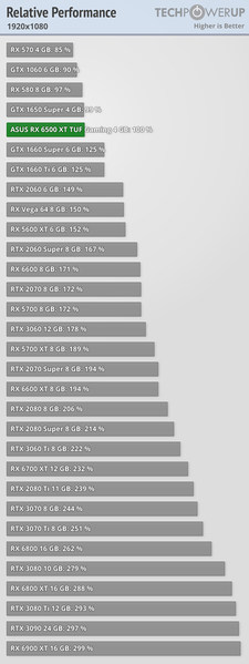 В реальности, как видим, всё не так плохо. Если говорить в относительном выражении, то RX 6500 XT в среднем выступает на уровне GeForce RTX 1650 Super или RX 580 8GB. Самая популярная в Steam модель GTX 1060 6GB отстаёт примерно на 10%. Сравнение с RX 580 очень показательно, так как у последней вдвое больше памяти и вчетверо шире шина. Как видим, это далеко не единственные факторы, влияющие на производительность.