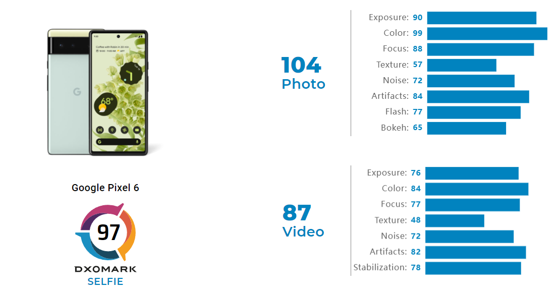 Pixel 6 получил 97 баллов. Ровно столько же, к примеру, у Samsung Galaxy Note20 Ultra. Также результат сравним с Galaxy S21 и всей линейкой iPhone 12. При этом, если мы говорим в первую очередь о фото, то Pixel 6 получил уже 104 балла, а это больше, чем у iPhone 12 и iPhone 13 любой модели. С видео ситуация хуже (87 баллов).