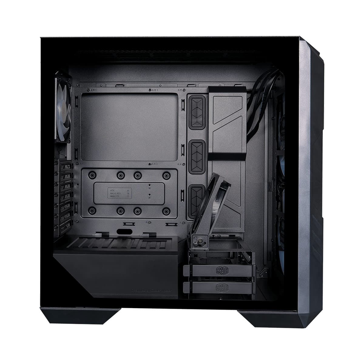 Помимо двух уже упомянутых 200-миллиметровых вентиляторов производитель устанавливает два 120-миллиметровых. Один из них расположен на задней стенке, а другой — на корзине для накопителей. Его задача — создавать поток воздуха для охлаждения видеокарты. Вместо 200-миллиметровых вентиляторов на передней стенке можно поставить два 140-миллиметровых или три 120-миллиметровых. Кроме того, на верхней стенке можно закрепить три 120-миллиметровых или два 140-миллиметровых или два 200-миллиметровых вентилятора. В вариантах с СЖО верхняя и передняя стенки подходят для радиаторов длиной до 360 мм, задняя — для 120-миллиметрового радиатора.
