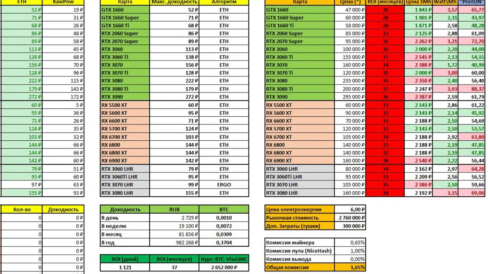 Добытчик криптовалюты из России, известный под ником ProTON, опубликовал обновленный документ доходности разных видеокарт с учетом нынешних реалий крипторынка. Абсолютным аутсайдером с точки зрения самоокупаемости оказалась Radeon RX 6900 XT – ее относительно невысокая (в сравнении с флагманами Nvdia) цена не компенсирует низкую производительность при добыче Ethereum. А с учетом нынешнего падения котировок на крипторынке, получается, что купленная за 160 000 рублей Radeon RX 6900 XT, вернет затраченные на нее средства только через 38 месяцев. Возможно, именно из-за этого Radeon RX 6900 XT достаточно легко купить – потому что майнерам она не так интересна, как другие 3D-карты.