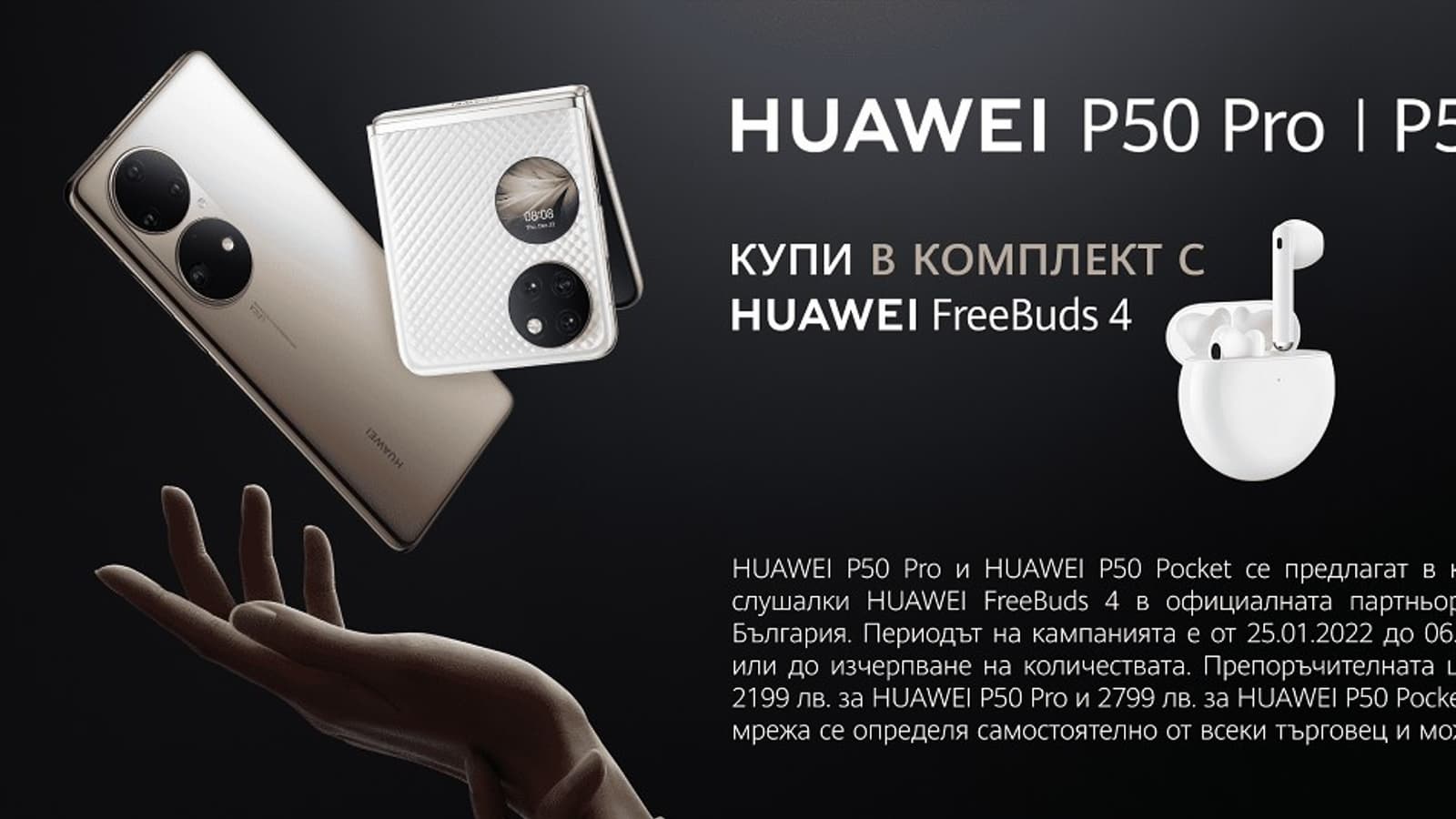 В Европе начали принимать предварительные заказы на смартфоны Huawei P50 и P50 Pocket. В Болгарии P50 Pro оценен в 1125 евро, конфигурация только одна – с 8 ГБ ОЗУ и 256 ГБ флеш-памяти. Период предварительных заказов закончится 6 февраля.