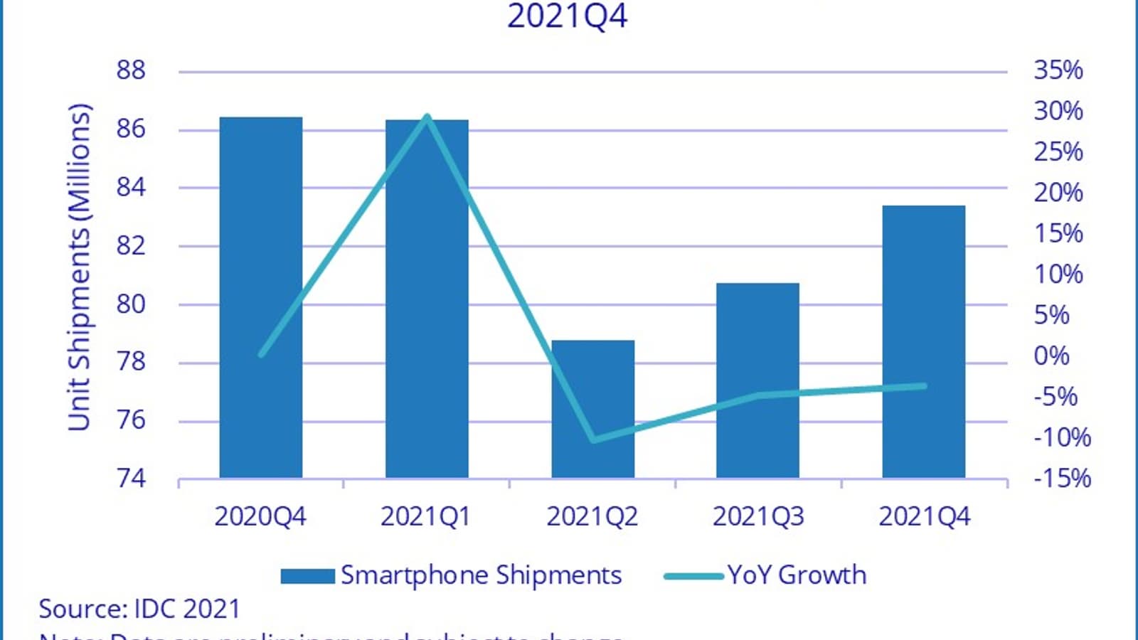 По данным аналитической компании IDC, в 2021 году в Китае было отгружено 329,3 млн смартфонов. Это на 1,1% больше, чем в 2020 году. При этом в первом квартале наблюдался рост на фоне программ стимулирования спроса, связанных с пандемией, но в следующих кварталах он сменился спадом. Причинами спада аналитики называют проблемы с поставками компонентов, ограничившие предложение, и более низкий, чем ожидалось, спрос на смартфоны среднего и верхнего ценового сегмента.