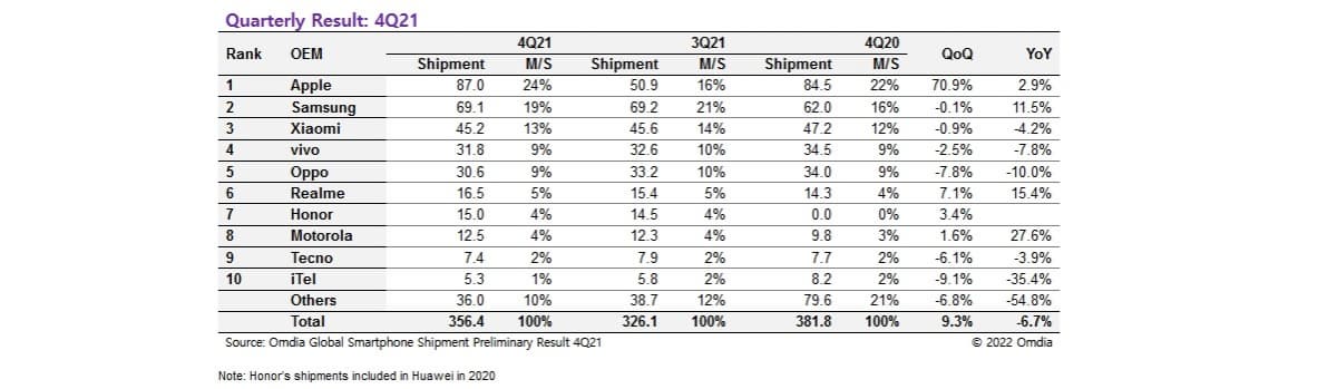 Всё выше по списку продвигается Realme, а также стоит отметить успехи Motorola. Напомним, прошедший квартал стал для компании рекордным на родном рынке. Кроме того, 2021 год стал первым, когда Honor стала самостоятельной компанией и теперь фигурирует в соответствующих статистиках отдельно. Пока на восьмом месте.