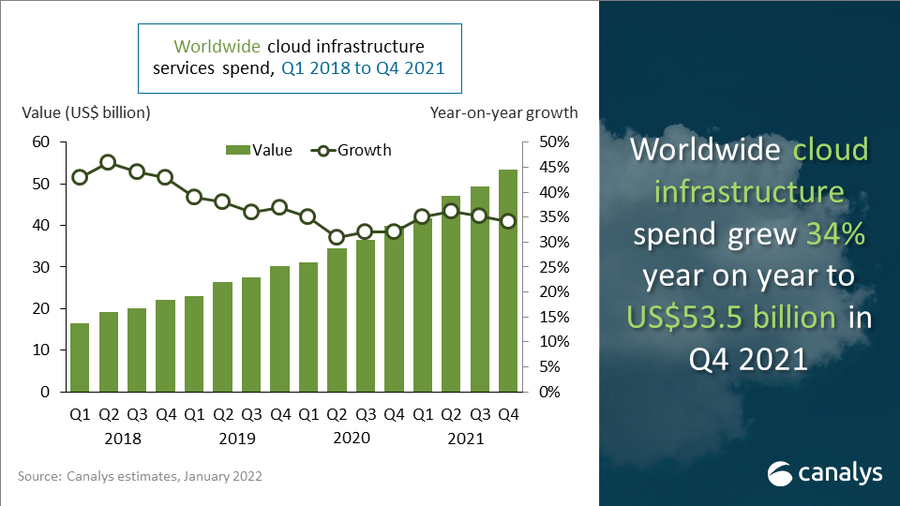 Мировые расходы на услуги облачной инфраструктуры впервые превысили 50 млрд долларов за квартал в четвертом квартале 2021 года. В годовом выражении они выросли на 34% и достигли 53,5 млрд долларов. Такие данные приведены в отчете Canalys.