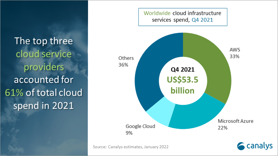 Лидером в четвертом квартале 2021 года была компания Amazon Web Services (AWS), на которую пришлось 33% всех расходов. Выручка AWS в годовом выражении выросла на 40%. Microsoft Azure занимает второе место с 22%. Рост Microsoft Azure составил 46%. Третьим по величине провайдером облачных услуг является Google Cloud. Продемонстрировав рост на 63%, Google Cloud занимает 9% рынка.