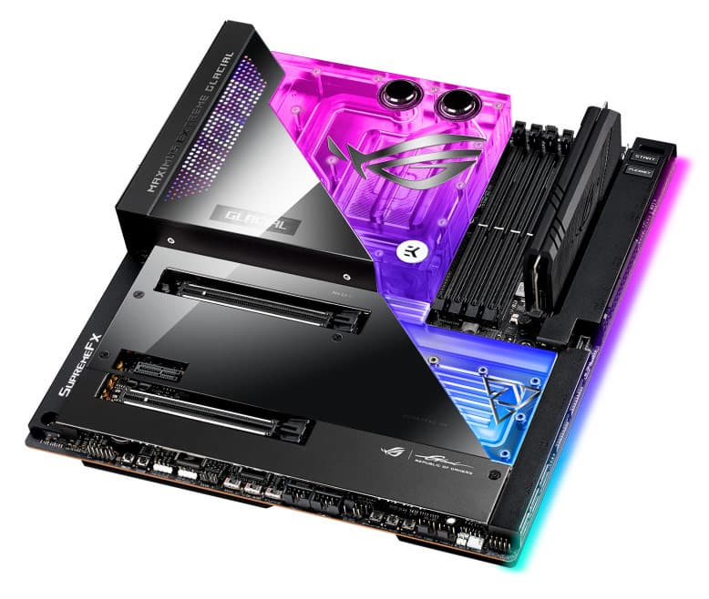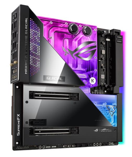 Компания Asus представила системную плату ROG Maximus Z690 Extreme Glacial. Это плата типоразмера E-ATX (305x277 мм), построенная на наборе системной логики Intel Z690, рассчитанная на процессоры Intel Core 12-го поколения в исполнении LGA 1700 и оснащенная водоблоком. Водоблок EK UltraBlock отводит тепло от процессора, подсистемы питания, чипсета и твердотельного накопителя типоразмера M.2.