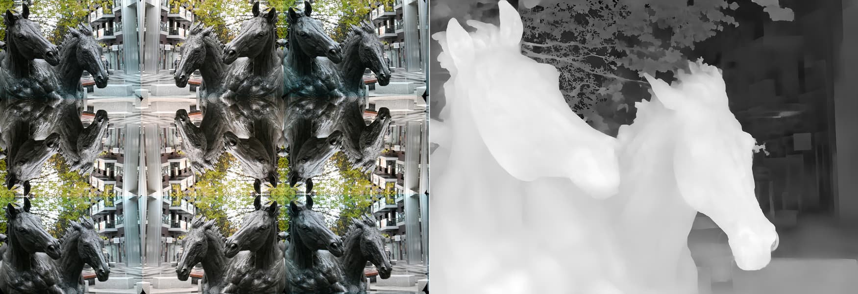 На нижней иллюстрации приведен снимок, сделанный с помощью K-Lens One на Nikon Z7, и карта глубины, созданная в программном обеспечении компании с использованием информации, собранной из девяти изображений, которые создает зеркальный туннель в объективе.