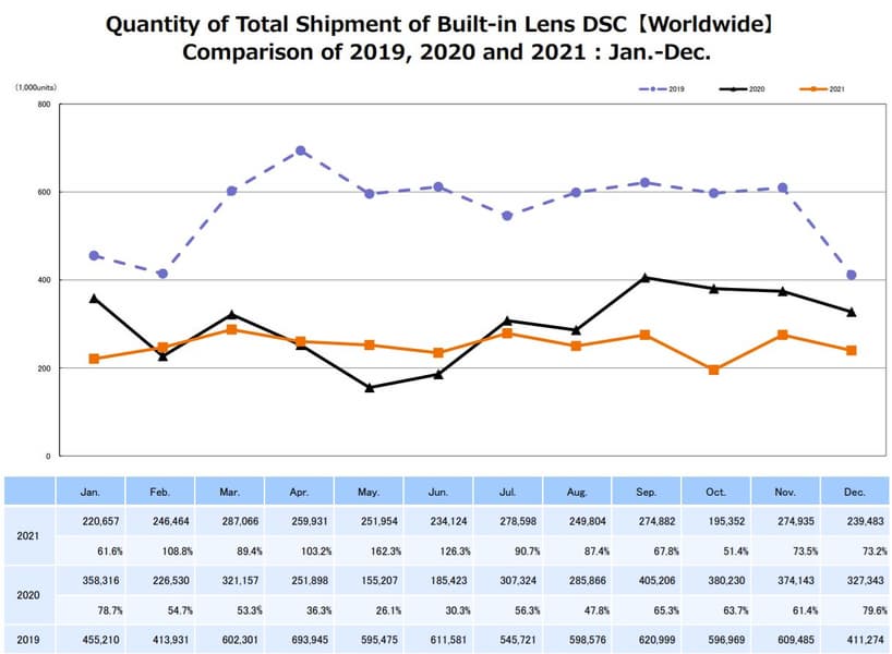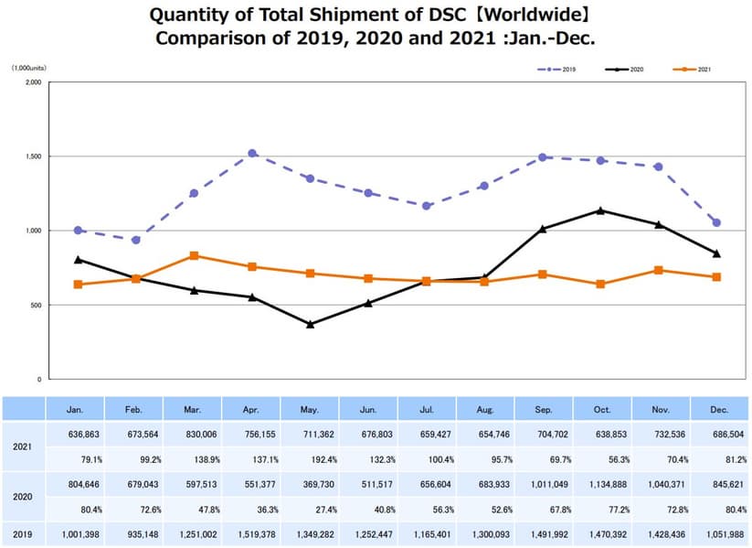 Японская ассоциация CIPA, в которую входят Canon, Fujifilm, Nikon, Panasonic, Ricoh, Sony и другие производители фототехники, опубликовала очередную порцию статистики продаж цифровых камер и сменных объективов. На этот раз на регулярно обновляемых графиках отображены данные за последний месяц 2021 года.