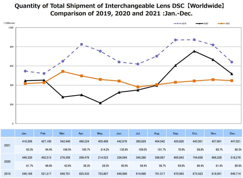 Камер со сменными объективами в декабре было продано 447 021. Это равно 86,3% показателя за декабрь 2020 года. Для сравнения: в ноябре был зафиксирован показатель 457 601, что равно 68,7% показателя за ноябрь 2020 года.