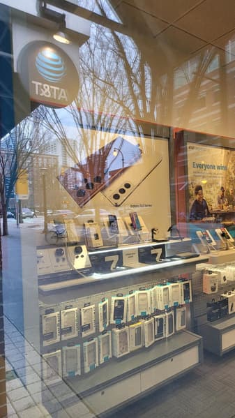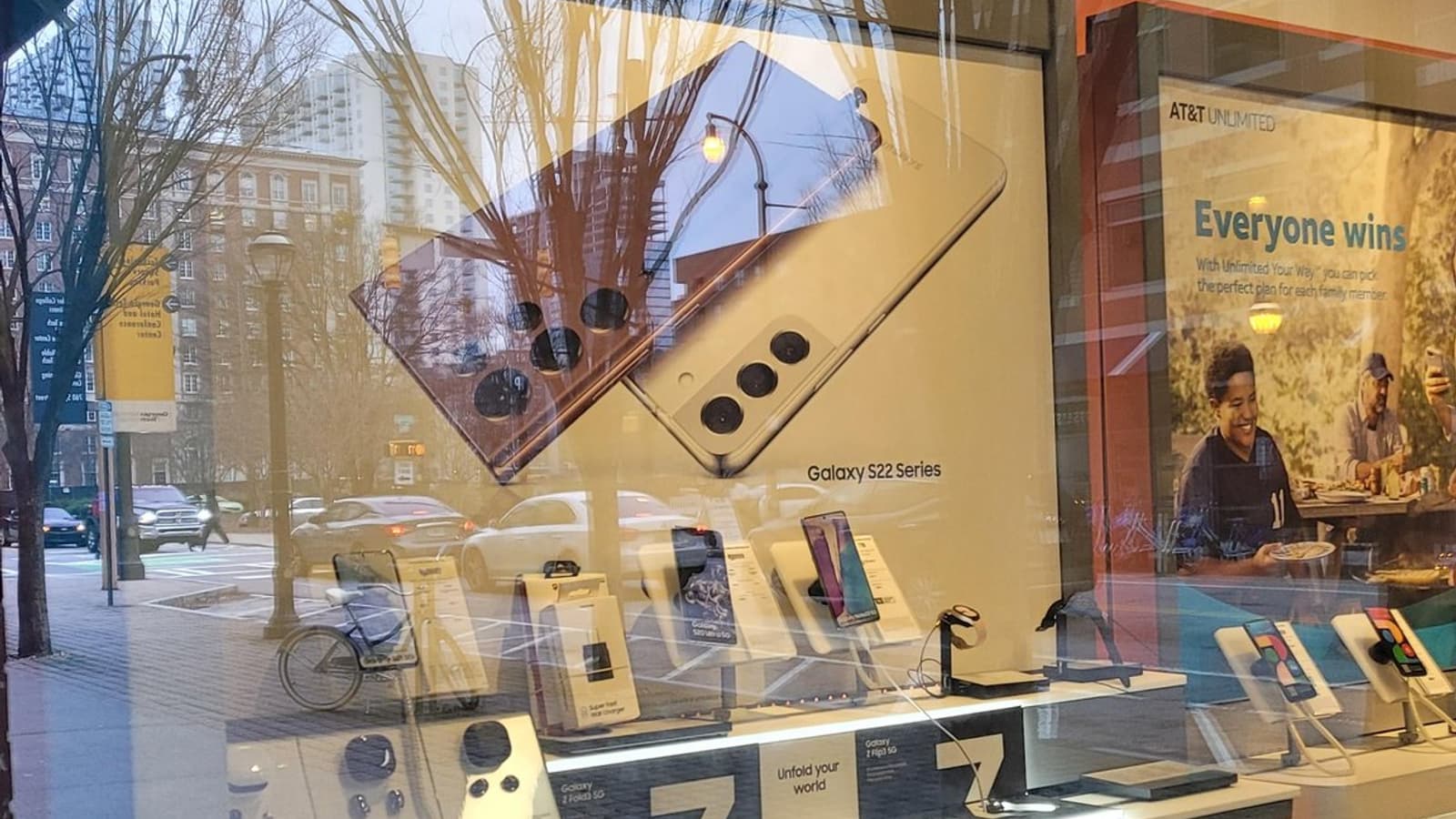 К примеру, в одном из магазинов AT&T был замечен огромный постер, на котором изображён Galaxy S22 Ultra и S22 или S22+.