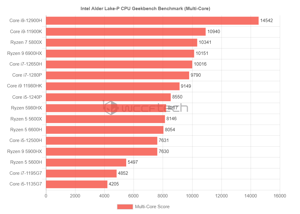 Core i7-1280P опережает своего собрата на 15%, при он заодно и быстрее, чем Core i9-11980HK. Напомним, речь идёт о 28-ваттных процессорах, которые оказываются быстрее большинства (или всех в случае Core i7-1280P) высокопроизводительных 45-ваттных CPU прошлого поколения. Особенно впечатляет то, что Core i7-1280P уступает настольному Ryzen 7 5800X лишь 5%, а Core i5-1240P обходит настольный Ryzen 5 5600X.