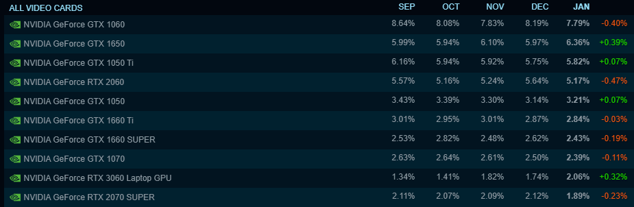 Сервис Steam опубликовал статистику по игровому оборудованию за январь. Самой популярной видеокартой у геймеров по-прежнему является GeForce GTX 1060, но за месяц ее позиции немного пошатнулись – минус 0,4 процента. И практически на те же 0,4 процента прибавила находящаяся на втором месте GeForce GTX 1650. На третьем месте – GeForce GTX 1050 Ti с совсем небольшим плюсом.
