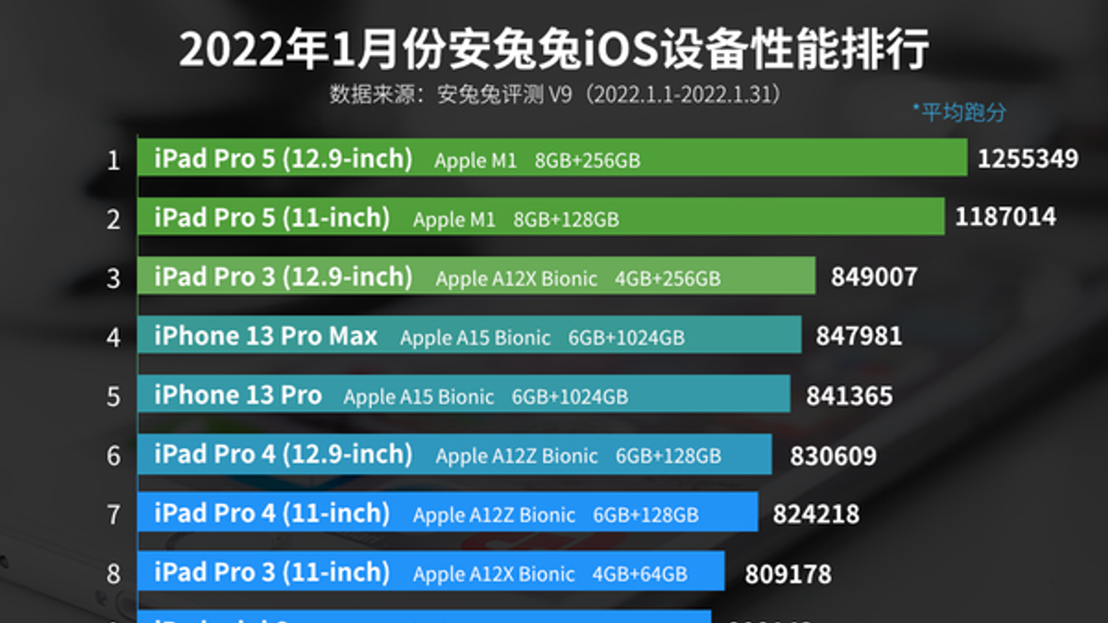 Если Android-смартфоны только с выходом Snapdragon 8 Gen 1 превзошли отметку в 1 000 000 баллов в AnTuTu, то iPad Pro 5 на платформе M1 давно преодолел этот барьер. С результатом более 1 250 000 баллов он возглавил январский рейтинг производительности устройств Apple под управлением iOS.