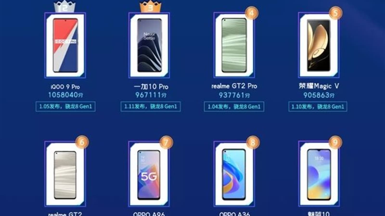 Остальные модели модели в топ-5 тоже базируются на этой однокристальной системе Qualcomm. В их числе — iQOO 9 Pro, OnePlus 9 Pro, Realme GT2 Pro и первый складной смартфон Honor Magic V.