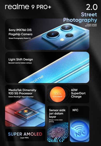 В частности, топовый Realme 9 Pro+ получит и одну из самых производительных в классе платформ — MediaTek Dimensity 920 — и корпус с изменяемым цветом, и 60-ваттную зарядку SuperDart, и 90-герцевый дисплей AMOLED диагональю 6,4 дюйма, и аккумулятор ёмкостью 4500 мАч. Кроме того, камеру возглавит известный по многим флагманам датчик Sony IMX766, ещё и дополненный оптической стабилизацией.