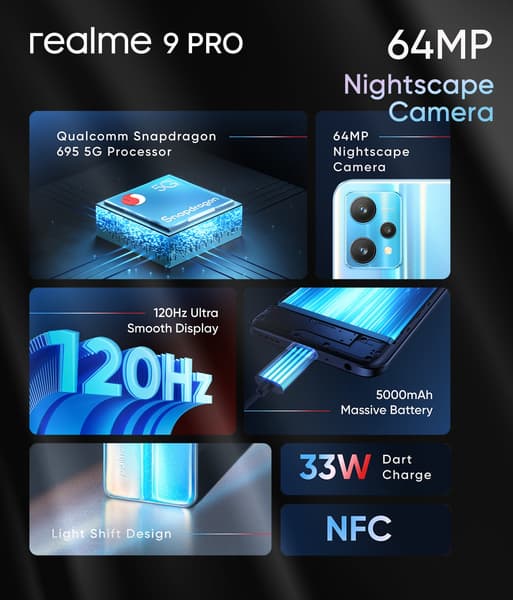 Realme 9 Pro получит Snapdragon 695, 64-мегапиксельную камеру, 120-герцевый дисплей (вероятно, IPS), аккумулятор ёмкостью 5000 мА•ч и 33-ваттную зарядку.