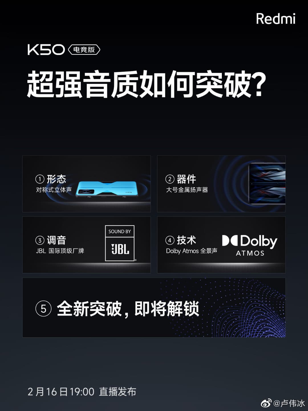 Лу Вейбин добавил, что для достижения нового уровня звука на смартфоне пришлось использовать новые резонаторы и обратиться за помощью к производителю профессионального аудиооборудования JBL. Также он утверждает, что Redmi K50 Gaming Edition поддерживает технологию Dolby Atmos.