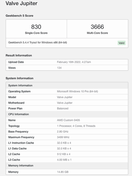 Geekbench опознал консоль как Valve Jupiter, а её платформу — как AMD Custom 0405. Четырёхъядерный CPU поддерживает многопоточность, имеет 4 МБ кеш-памяти третьего уровня и работает на частоте 2,8-3,5 ГГц. APU относится к семейству Van Gogh и оснащён встроенным GPU с восемью вычислительными блоками и частотой 1,0–1,6 ГГц.