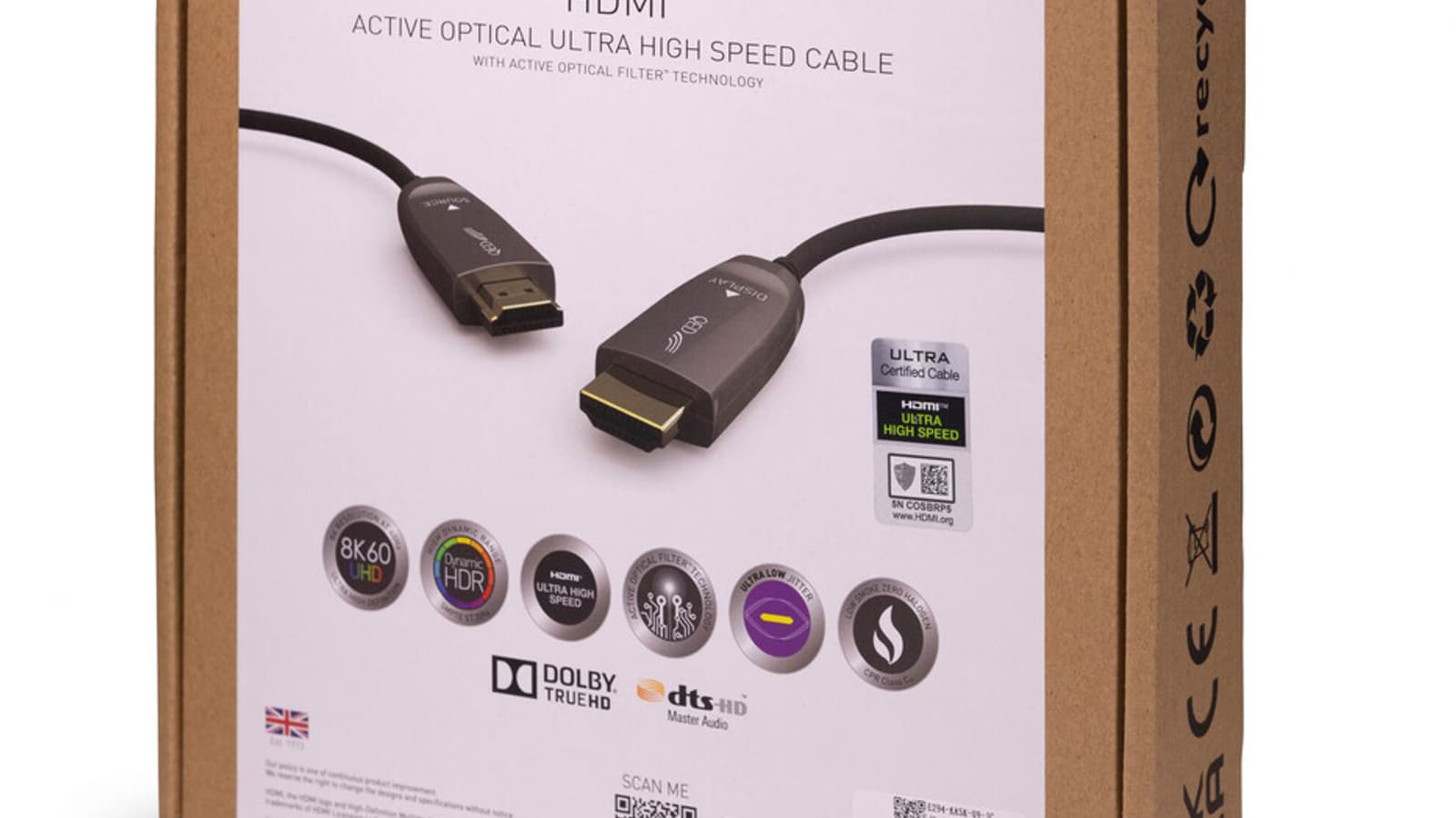 Кабель, совместимый с HDCP 2.2, CEC, DDC, HDR, HEC и eARC, имеет соответствующую маркировку аккредитованной лаборатории HDMI Forum. Чтобы проверить подлинность кабеля QED Ultra Speed Active Optical HDMI, производитель предлагает отсканировать QR-код на этикетке с помощью официального приложения HDMI.