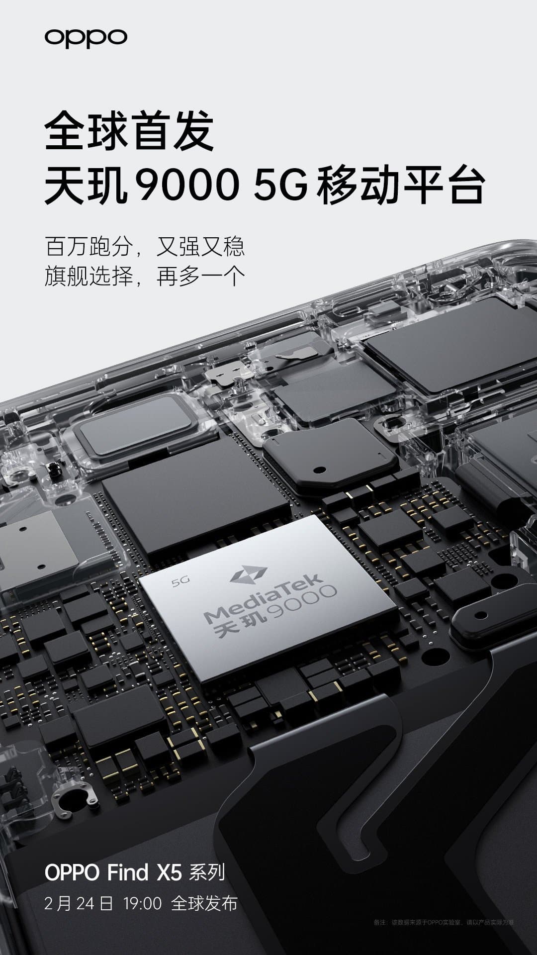 Oppo опубликовала официальный тизер с изображением «внутренностей» смартфона Find X5. Внимание на картинке акцентировано на однокристальной системе – это Dimensity 9000. Таким образом, Oppo Find X5 официально станет первым в мире смартфоном на этой топовой SoC MediaTek.