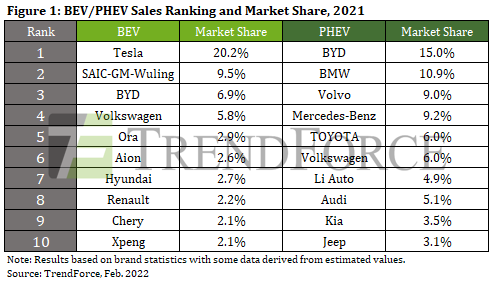 Первое место в сегменте BEV заняла компания Tesla с общим объёмом мировых продаж более 930 000 штук и долей рынка 20,2%. Второе место заняла SAIC-GM-Wuling, воспользовавшись высоким спросом на недорогие мини-электромобили. Другие бренды, такие как Ora и Chery, также значительно увеличили показатели продаж благодаря мини-электромобилям. Эксперты TrendForce отмечают, что доля десяти ведущих брендов BEV снизилась с 64,4% в 2020 году до 57% в 2022 году, что свидетельствует об обострении конкуренции. Первое место в сегменте PHEV заняла компания BYD. Она продала 273 000 электромобилей, что составляет 15% рынка. Показатели первой десятки в обоих сегментах приведены в таблице: