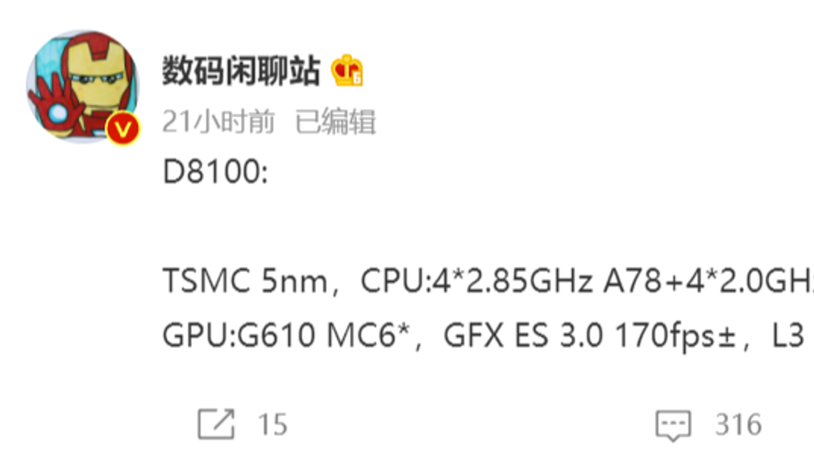 Инсайдер, известный в Weibo под ником Digital Chat Station, раскрыл параметры перспективной однокристальной системы MediaTek Dimensity 8100. По словам информатора, Dimensity 8100 будет производиться (скорее всего, уже производится) TSMC по нормам технологического процесса 5 нм, имеет в своем составе двухкластерный CPU с четырьмя ядрами Arm Cortex-A78 частотой 2,85 ГГц и четырьмя ядрами Arm Cortex-A55 частотой 2,0 ГГц, а также GPU Arm Mali-G610 MC6. Объем кэш-памяти третьего уровня составил 4 МБ, SoC поддерживает оперативную память LPDDR5 и флеш-память UFS 3.1.