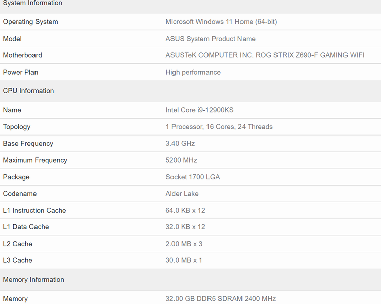 В состав платформы, использовавшейся для тестов Core i9-12900KS в Geekbench, использовалась материнская плата Asus ROG Sstrix Z690-F Gaming с 32 ГБ памяти DDR5-4800. Этот процессор, напомним, работает на частоте 3,4-5,5 ГГц, что на 200 и 300 МГц соответственно выше частот Core i9-12900K. Соответственно, выше и TDP: 150 Вт в базе и 260 Вт в максимальном варианте.