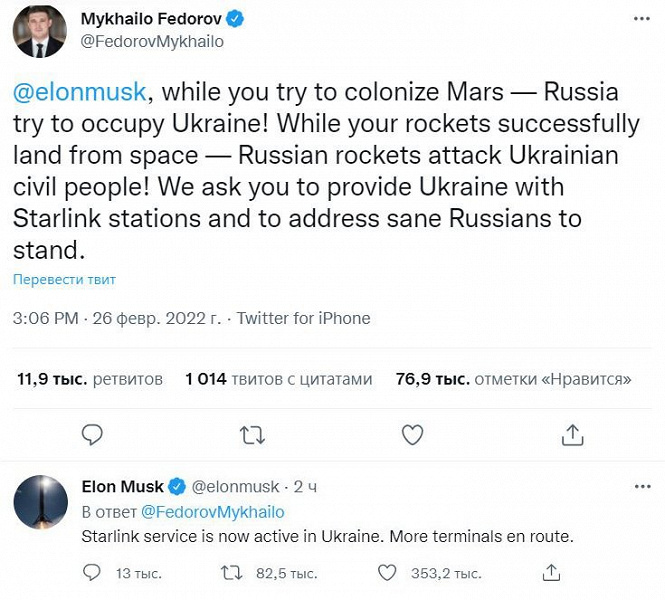 После начала военной операции на Украине во многих населенных пунктах страны наблюдаются проблемы с доступом в Сеть. Одно из решений – использовать спутниковый интернет Starlink, оператором которого является компания Илона Маска SpaxeX. И именно об этом Министр цифровой трансформации Украины Михаил Федоров попросил Маска в Twitter.