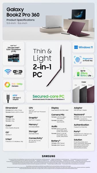 Все версии также оснащены 16 ГБ ОЗУ, SSD объёмом 512 ГБ или 1 ТБ, камерой Full HD, стереодинамиками с шильдиком AKG, сканерами отпечатков пальцев, микрофонами с системой шумоподавления, адаптерами Wi-Fi 6E и Bluetooth 5.1. Ёмкость аккумулятора у 13-дюймовых моделей составляет 63 Вт•ч, а у 15-дюймовых моделей — 68 Вт•ч. У Galaxy Book2 Pro 360 в комплекте будет стилус S-Pen.