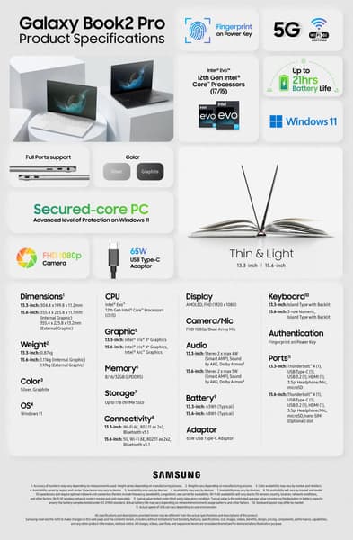 - Galaxy Book2 Pro 13.3 — 304,4 х 199,8 х 11,2 мм при массе 870 г