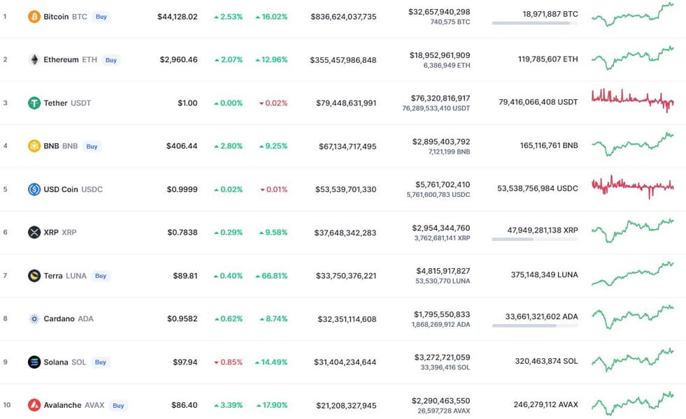 На данный момент 1 BTC стоит уже около 44 000 долларов, хотя ещё вчера за него давали около 41 000 долларов: уже два дня подряд Bitcoin прирастает на 3000 долларов. Однако если оценивать рост за неделю, то в топ-10 есть абсолютный рекордсмен, и это Terra: стоимость её за этот промежуток времени выросла почти на 70%!