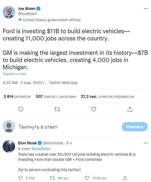 И, естественно, на такое заявление не мог не отреагировать Илон Маск (Elon Musk), компанию которого в Белом доме продолжают усердно игнорировать. В ответ он написал: «Tesla создала более 50 000 рабочих мест в США в электромобильной отрасли и инвестирует более чем в два раза больше, чем GM и Ford вместе взятые». А чуть ниже дописал: «для человека, контролирующего этот Twitter». Как и во многих подобных случаях, ответ Маска получил намного больше лайков и ретвитов, чем оригинальное сообщение.