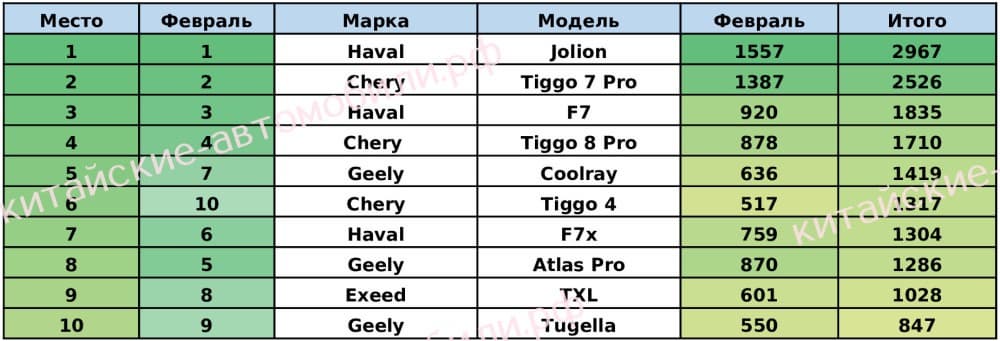 За февраль было продано 1 557 единиц Haval Jolion, а продажи за два месяца составили 2967 машин. Рекордным месяцем для модели стал декабрь 2021 года, когда продажи составили 2636 машин. Второе место занимает Chery Tiggo 7 Pro, который купили 1387 человек в феврале и 2526 человек за первые два месяца. Третье место досталось кроссоверу Haval F7.