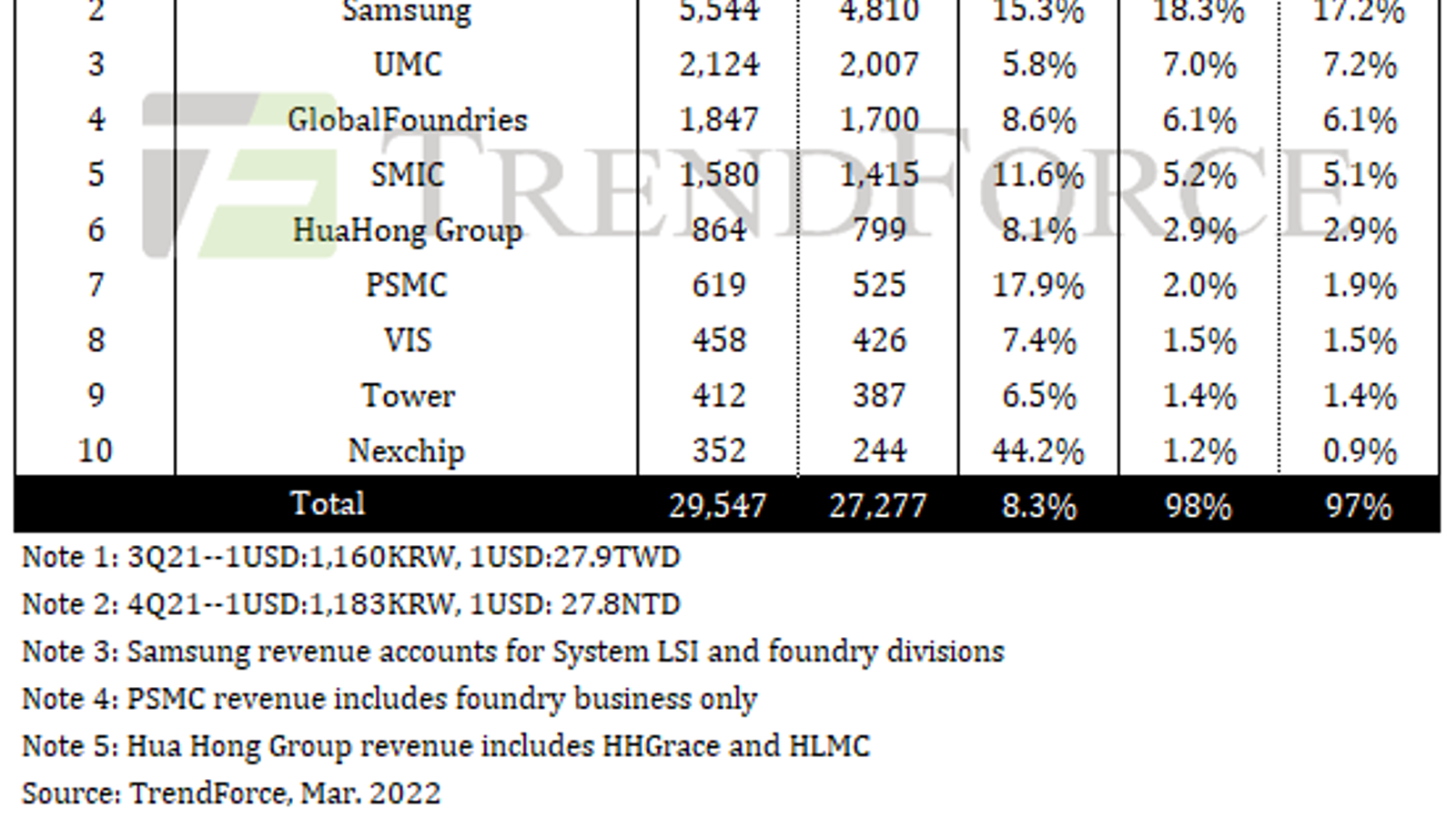 В TrendForce полагают, что выручка десяти ведущих контрактных производителей, которые суммарно занимают 97% рынка (из которых первые пять — почти 90%), сохранит тенденцию роста в текущем квартале. При этом основным двигателем роста по-прежнему будет увеличение ASP.
